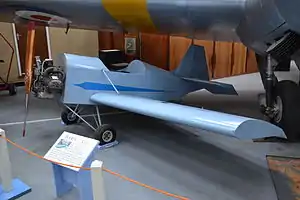 The fuselage is built around four 3/4 in (19 mm) square longerons, with diagonal bracing and ply formers. The skin is 1/16 in (1.6 mm) ply, with flat surfaces apart from curved decking. There is a single seat open cockpit. The fixed tailwheel undercarriage has each mainwheel mounted on a pair of steel tubes forming a narrow 'V' and fixed under the fuselage. Single bracing struts run forward from the wheel mountings to the lower longerons forward of the wings. Go-Kart wheels and tyres are used, without brakes. A two-cylinder, horizontally-opposed 14 horsepower Douglas motorcycle engine, built in 1925 and driving a two blade fixed pitch propeller, was the original powerplant though this may have been replaced later by a Sachs-Wankel motor.[1]
