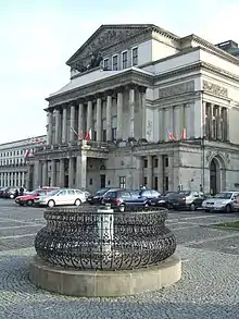 In 1880, in the Theatre Square in front of the Jabłonowski Palace (then the city hall), a stone pillar was erected surrounded by an iron railing with a sign indicating the geographical location and the height above sea level and the level of Vistula. The Warsaw meridian passes through the top of the pillar and top of the clock tower of the Jabłonowski Palace, which served as point measurements. The plate on the sidewalk was constructed much later, in 1965.