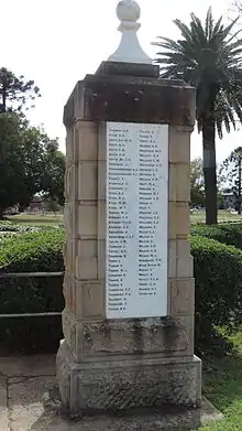 The Warwick War Memorial is situated in the south eastern corner of Leslie Park, inside the Memorial Gates which address the corner of Fitzroy and Palmerin Street, Warwick.[1]