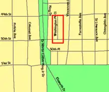 Washington Park Court, which runs one-way northbound from East 50th Street to East 49th Street, is a one-city block-long street located at 432 east in the Chicago street numbering system. Officially, it runs from 4900 south to 5060 south in the numbering system.[3] The street and several adjacent homes at one end are recognized as a distinct district within the city, according to the City of Chicago Department of Planning and Development.[2] In May 1990, the district was one of ten that were under consideration for Chicago Landmark status,[7] and it was designated a Chicago Landmark on October 2, 1991.[2] The district was named for the Park,[3] which was designed by landscape architect Frederick Law Olmsted.[8]