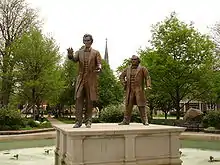 The park's central patio is dominated by a fountain and reflecting pool centered with larger-than-life depictions of Abraham Lincoln and Stephen A. Douglas.[5] The fountain and reflecting pools, and thus, the statues, are in a plaza which is surrounded by limestone. The statue project was completed by artist Rebecca Childers Caleel with metal casting completed by Art Casting of Illinois.[3] The bronze statues were completed under the guidance of the city's historic preservation commission and dedicated on September 14, 2002. The Lincoln statue is 11 feet (3.4 m) tall and the Douglas statue is 9 feet (2.7 m) tall.[3] Because of their recent installation, the statues are not part of the historic district.[4]