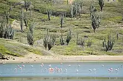 The salt pans are a special area and home to the Caribbean flamingo (Phoenicopterus ruber). The Pekelmeer Flamingo Sanctuary[6] is set in mud pockets.[7][8]