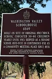 The Washington Valley Schoolhouse, also known as the Little Red Schoolhouse, is located at the intersection of Washington Valley Road and Schoolhouse Lane in the Washington Valley section of Morris Township in Morris County, New Jersey, United States. The schoolhouse was built in 1869 and was added to the National Register of Historic Places on October 15, 1973, for its significance in education.[3] It was designated a contributing property of the Washington Valley Historic District on November 12, 1992.[4]