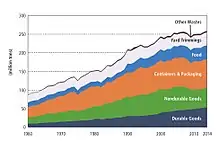 As a nation, Americans generate more waste than any other nation in the world, officially with 4.4 pounds (2.0 kg) of municipal solid waste (MSW) per person per day,[1] with another study estimating 7.1 pounds (3.2 kg) per capita per day.[2] Fifty five percent of this waste is contributed as residential garbage, while the remaining forty five percent of waste in the U.S.'s 'waste stream' comes from manufacturing, retailing, and commercial trade in the U.S. economy.[3] According to the American Society of Civil Engineers, Nevada produces the most waste at "[nearly] 8 pounds (3.6 kg) per person per day".[4] Approximately 90% of all waste produced by Nevadans ends up in landfills. "Wasteful" states Michigan, New Mexico, Wisconsin and Oregon as well as Washington also dominated the list's 5-year period.[5]