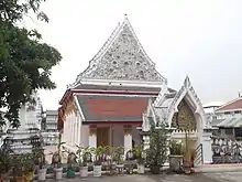 The ordination hall, built in the third reign, is in the Chinese architectural style. The gable ends are decorated with porcelain made in floral designs. Inside are the Sukhothai style principle Buddha image in the attitude of meditation, surrounded by fifteen Buddha images. There are four chedis located at the four compass points of the ordination hall. The consecrated boundary encompasses an area of 16 meters in width and 21 meters in length. In 2007, Ms. Phanid Amon donated money to improve the ordination hall and it has been registered as an archaeological site of the Fine Arts Department such as murals.