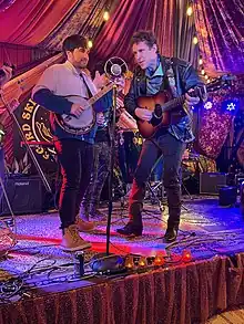 It was while busking that Water Tower met another new member, Jesse Blue Eads, a young banjo player and electric bassist who had dropped out of college to pursue music.[21] One day he got a call from a friend, letting him know that someone was in his usual busking spot in Hermosa Beach. It turned out to be the band and the four of them became fast friends. They asked Eads to join them on their next tour of the West Coast in summer 2021.[22] One of the shows on this tour was presented by Thompson Guitars near their workshop in Sisters, Oregon.[19] Feinstein, who plays a custom Thompson dreadnought with an extra-large sound hole inspired by bluegrass legends Clarence White and Tony Rice, is a featured musician on the Preston Thompson Guitars website.[23][19][8] They also played at Summer's End – The Draper Rendezvous festival in Hailey, Idaho with Sarah Shook & the Disarmers and John Craigie.[24] When they returned from touring, Feinstein and Drinkard started hosting a monthly bluegrass open mic event at Silverlake Lounge in Silver Lake called “Hillbilly Hype House”.[17][8]