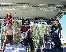 In 2017 Feinstein met Joe “Juice” Berglund working in his neighbor's yard and asked him to join the band on fiddle and bass.[16] Berglund is a self-taught musician who had been travelling the country and living out of his car prior to that. A year later the band met Joanne Ledesma who would become their manager.[17][16] Tommy Drinkard met Feinstein by chance when he was invited to a jam at his house. He stuck around and became the band's banjo player in 2019 after taking lessons from Feinstein.[16] Drinkard's first gig with Water Tower was the 2019 Huck Finn Jubilee, which Feinstein also performed as MC for.[18][16] By 2020 Berglund and Drinkard would replace Daggatt, Norris, and Selick as the main line up, although the others would continue to play in Water Tower occasionally.[19][14]