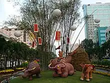 The buffalo is the second animal symbol in the 12-year cycle of the Vietnamese zodiac, taking the place of the Ox in the Chinese zodiac. Water buffalo are industrious and patient. In general, the year is slow and steady, appropriate for scientists. The hours of the buffalo are from 1 to 3 am.[1]