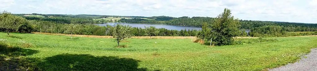 Looking across Matthew Lake from the Allan Wile Hill to the Isaac Wile Hill, Waterloo, Nova Scotia. Allan was the son of Isaac. The practice of building homes and clearing land on the tops of drumlins was the standard settler practice. Both these hills are approximately 125 metres above sea level. A narrow isthmus separates Matthew Lake from Frederick Lake. The Adelbert Wile road runs through this connecting the hills.