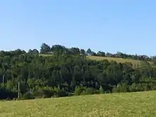 On the horizon is the original drumlin cleared by George "Michael" Wile and his wife Lucinda "Lucy" Hirtle. This hill is the one Lucy refers to from the early days of the settlement when she speaks of spreading a quilt between the stumps to place her basket of children on, and then another quilt above them for shade, when she was "reaping and doing other work".