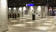 All stations on the East Line were set for another renovation in 2016. The renovation of Waterlooplein commenced in September. The architect of the renovation wanted to revert to the brutalist architecture used in the original station design. Paint on the walls were removed to reveal the bare concrete. Metro traffic still continued as entrances were closed one by one.[21] Some of the features added after initial construction, such as the usage of primary colours and a black ceiling, were kept after the renovation.[22] Windows were created at two of the entrances.[23][24] Cables, cable ducts and pipes were concealed for tidiness.[25] Het Parool wrote that after the renovation "[the station] suddenly look[s] as if [it is] no longer just from the past, but also a bit from now."[26] In April 2017, the Gemeente Vervoerbedrijf started to play music through the speakers of underground metro stations as a test. The type of music would depend on the time of day: slow and calming music during rush hours, and energetic music during the afternoon.[27]