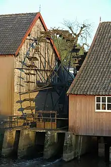 The buildings are made of painted wood on a brick foundation, with tiled roofs, and an extruding hatch covering the main entrance of the higher building.[5] The gristmill, originally used to grind spelt, later ground bread wheat, and then a sawmill was added. It has a water wheel of 9.30 metres (30 ft 6 in) in diameter, consisting of 44 paddles of 80 centimetres (2 ft 7 in) width, which makes it the largest water wheel in the Netherlands.[6] The gristmill is still in functioning order, and uses a pair of Cullen millstones from Mayen ("Cullen" for "Cologne", where such millstones were marketed from[7]), and a pair of cast millstones, both 17 hands in diameter or 1.50 metres (4 ft 11 in). Only some remainders are left of the sawmill, including one of only two watermill circular saws in the Netherlands.[1][2] Inside the larger mill is a room for the assistants of the miller, where the names of millers and their assistants have been carved in the wood.[4]