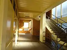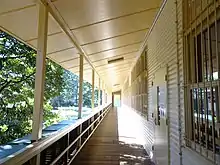 The covered links between the buildings are highly intact. Most are two-storey, concrete-framed with unpainted concrete or timber floors, have metal balustrades, and have ceilings lined with sheets and battens with original ceiling light fittings. The links off Block J retain original timber framed enclosures on the western side of the ground floor, although the large windows and wide double doors have been removed.[1]