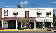The brick building measures 11,853 sq ft (1,110 sq m) and is two-stories tall, not including the basement level.[1][180] It features six bays, a flat metal roof, and a rear shed. A portion of the façade includes a one-story porch supported by four Tuscan columns. A metal spiral staircase leading to a door on the second floor interrupts the porch. The main entrance is a set of French doors, composed of fifteen windows, flanked by sidelights. Above the main entrance are decorative wood panels. There are two other doors on the façade in addition to the set of French doors leading to the former cafe. Above this set of doors are wood panels. The side of the building has four entrances.[1] Due to the age of the building and its architectural integrity, the former theatre is a contributing property to the Middletown Historic District, which was listed on the National Register of Historic Places and Virginia Landmarks Register in 2003.[1][2]