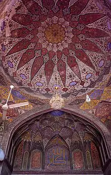 Walls of the prayer hall's interior are also decorated with calligraphy in both Arabic and Persian.[24] Each wall is divided further, and contain unique mosaic designs.[26] The acoustic properties of the dome allow for the imam's sermon to be projected across the mosque's courtyard.