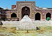 Wazir Khan's mosque was part of a larger complex that included a row of shops traditionally reserved for calligraphers and bookbinders, and the town square in front of the mosque's main entrance.[14] The mosque also rented space to other types of merchants in the mosque's northern and eastern façades, and ran the nearby Shahi Hammam.[14][15] Revenues from these sources were meant to serve as a waqf, or endowment, for the mosque's maintenance.[16]