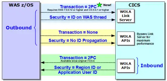The following picture summarizes the WOLA CICS support for transaction propagation and security assertion: