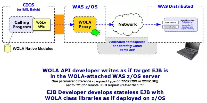 The WebSphere Optimized Local Adapters for WAS z/OS (WOLA or OLA for short) has its origins in a desire to provide an efficient inbound calling mechanism; that is, from outside the Java EE environment into it to exercise Java EE assets. This requirement was particularly pronounced on z/OS where traditional batch processing sought the use of a growing base of programming assets based on Java EE and EJB technology.