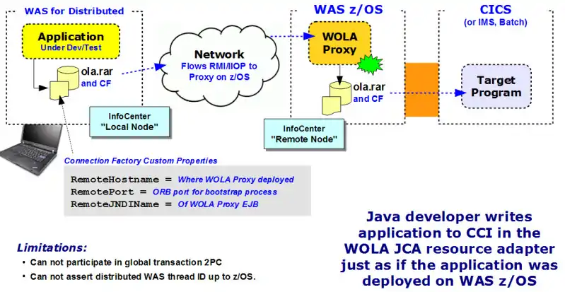 This provides a mechanism by which Java applications may use the supplied WOLA JCA resource adapter to access a target address space on remote z/OS. An example usage pattern would be development or test of a proposed an application. Access to the cross-memory WOLA connection on the target z/OS system is provided by a supplied WOLA proxy application installed in a WAS z/OS server enabled for WOLA. The following picture illustrates the topology: