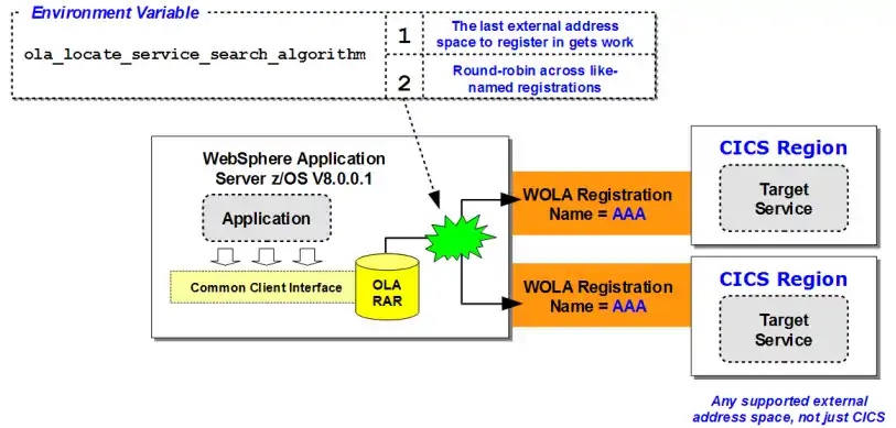 This functional update provides the ability to distribute outbound calls across multiple external address spaces registered into a given WAS z/OS server using the same registration name. A common usage pattern for this would multiple CICS regions with the same stateless target program service deployed. A new environment variable was created to indicate the type of work distribution desired. The following illustrates the usage of this function:
