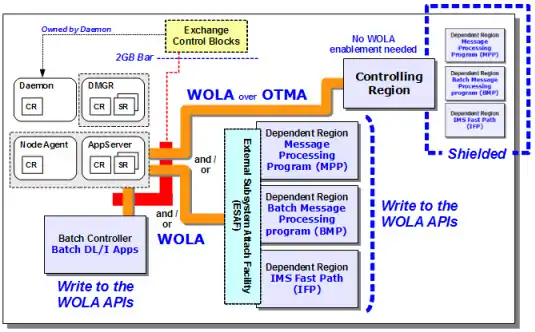IBM WebSphere Optimized Local Adapters (OLA or WOLA) is a functional component of IBM's WebSphere Application Server for z/OS that provides an efficient cross-memory mechanism for calls both inbound to WAS z/OS and outbound from z/OS. Because it avoids the overhead of other communication mechanisms, it is capable of high volume exchange of messages. WOLA is an extension to the existing cross-memory exchange mechanism of WAS z/OS, with WOLA providing an external interface so z/OS address spaces outside the WAS z/OS server may participate in cross-memory exchanges. WOLA supports connectivity between a WAS z/OS server and one or more of the following: CICS, IMS, Batch, UNIX Systems Services and ALCS. WOLA was first made available in WAS z/OS Version 7, Fixpack 4 (7.0.0.4). Functional enhancements have appeared in subsequent fixpacks as documented in this article.