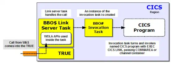 In addition, a Link Server Task (BBO$) and a Link Invocation Task (BBO#) is supplied for calls from WAS to CICS. The BBO$/BBO# link server task shields programming specifics from CICS programs. The OLA call from WAS is handled by these supplied tasks, and the named CICS program is invoked with the standard EXEC CICS LINK call. The named CICS program remains unchanged and unaware the call came from WAS using OLA. The target program in CICS must be able to be invoked with a LINK call. Both COMMAREA and Channels/Containers is supported.