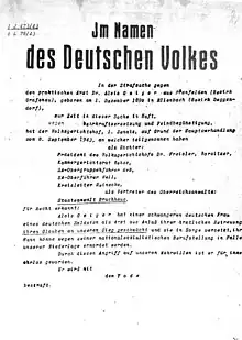 - ↑ These examples were translated from the German Wikipedia. Some of them bear a strong resemblance to a quote from Dr. Günther Vollmer, a Ministerial Director at the Reich Ministry of Justice. He wrote, "No longer tolerable and fundamentally worthy of death are [...] remarks of the following kind: The war is lost; Germany or the Führer picked a fight and senselessly or frivolously started the war and must lose it; the NSDAP should or will relinquish power and, like the Italian model, make way for the understanding of peace; a military dictatorship must be established and will be able to forge peace, one must work slowly in order to bring about the conclusion; an intrusion of bolshevism would not be as bad as the propaganda paints it, and will only harm the leading National Socialists; the English or the Americans will stop bolshevism at the German border; urging by word of mouth or letters to the front to throw down their guns or turn back; the Führer is sick, incompetent, a butcher, etc."