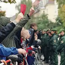 The view of the "unblemished" Wehrmacht was shaken by the material evidence put on public display in different cities including Hamburg, Munich, Berlin, Bielefeld, Vienna, and Leipzig.[3] On 9 March 1999 at 4:40am, a bomb attack on the exhibition occurred in Saarbrücken, damaging the adult high school building housing the exhibition and the adjoining Schlosskirche church.[5]