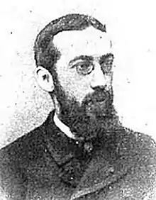 Standing portrait of 60-ish man with a white beard, mustache, and receding hairline, in circa-1900 formal dress with glasses, a high collar, a star-shaped badge on his jacket, and a blue and white sash, holding a glove and loosely pointing to a paper on a table.