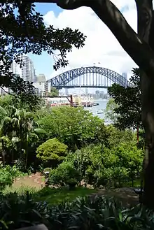 At considerable personal expense—reportedly some millions of dollars[11]—Wendy started to clean up and landscape a large patch of derelict land adjacent to her home in Lavender Bay, owned by the New South Wales Rail Corporation. It was choked by weeds and lantanas, and strewn with old train carriages, abandoned refrigerators, rotting mattresses and broken bottles. Homeless people sometimes slept there. The Rail Corporation had no interest in doing anything with it, and they raised no objections to her beautifying the area. They even helped by removing the larger pieces of junk. Wendy treated the garden like a giant painting, structuring, planting, pruning, moving things around, and letting nature do its work. Over a period of fifteen years, the garden became a coveted spot for those who had heard about or chanced upon it, with random benches in quiet spots, secluded paths, and a spectacular view to the Sydney Harbour Bridge.[12] A wide variety of birdlife previously unknown to the area arrived. It has been described as rivalling Claude Monet's garden. It is affectionately known by locals as "Wendy's Secret Garden", although the public have always had free access.[13] Features of the garden include an antique fountain from the Paddington garden of Margaret Olley, Bangalore palms donated by Arkie and objects found in the scrub, like an old tricycle and a child's scooter.
