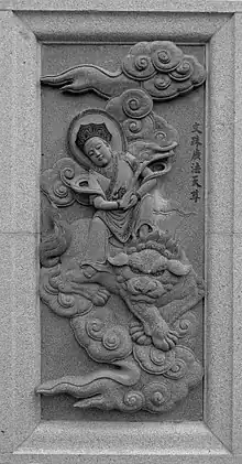 The character is believed to be derived from the bodhisattva Manjusri.[2][3] The books Qunxian Xianpo Tianmen and Western Tang Dynasty Biography states Wenshu Guangfa Tianzun and Manjusri Bodhisattva are not the same person.[4][5][6] It is believed that Manjusri Bodhisattva transformed into Wenshu Guangfa Tianzun, one of the protectors in Taoism, helping to resolve religious conflicts common in the Western regions.[7]