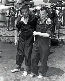 Werner Drechsler (left), recovering from a bullet wound to his right knee, disembarking the USS Osmond Ingram on 20 June 1943 in Norfolk, Virginia