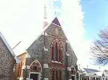 The church is set close to the road with a symmetrical façade, a tower and spire. It has a steeply pitched roof, parapeted gable and wall buttresses. The stone masonry is finished with brick trim.[2] The hall sits next to the church also has a symmetrical facade and a steeply pitched roof that includes a row of vents. It has a central arched doorway and five centred flat-topped windows above the door.[2] The manse has a symmetrical façade, stone construction with painted brick quoining around windows and doors. There is a central portico with arched entrance, a verandah with decorative timber posts and frieze. The main roof is hipped and topped with four distinctive chimneys.[2]