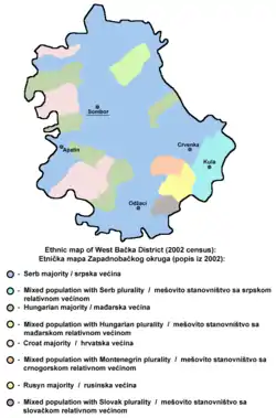 The West Bačka District (Serbian: Западнобачки округ, romanized: Zapadnobački okrug, pronounced [zâːpadnobâːtʃkiː ôkruːɡ]; Hungarian: Nyugat-bácskai körzet) is one of seven administrative districts of the autonomous province of Vojvodina, Serbia. It lies in the geographical region of Bačka. It has a population of 154,491 inhabitants. The administrative seat of the district is the city of Sombor.