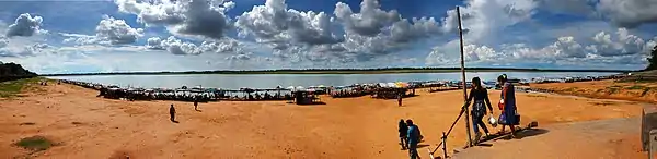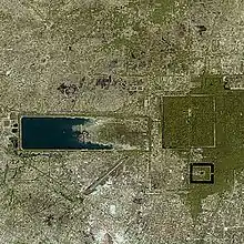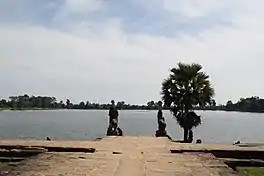 The West Baray (Khmer: បារាយណ៍ខាងលិច, UNGEGN: Baréayôn Khang Lĭch, ALA-LC: Pārāyaṇ ̊ Khang Lic [ɓaraːj kʰaːŋ ləc]) or Baray Teuk Thla (Khmer: បារាយណ៍ទឹកថ្លា, UNGEGN: Baréayôn Tœ̆k Thla, ALA-LC: Pārāyaṇ ̊ Dẏk Thlā [ɓaraːj tək tʰlaː]; "Clear Water Reservoir") is a baray, or reservoir, at Angkor, Cambodia, oriented east–west and located just west of the walled city Angkor Thom. Rectangular in shape and measuring approximately 7.8 by 2.1 kilometers, the West Baray is the largest baray at Angkor and one of the largest handcut water reservoirs on Earth,[1] possessing a current maximum capacity of 12 to 14 billion gallons of water (53 million m3).[1][2] Its waters are contained by tall earthen dikes measuring 11.9 meters in height.[1] In the center of the baray is the West Mebon, a Hindu temple built on an artificial island.