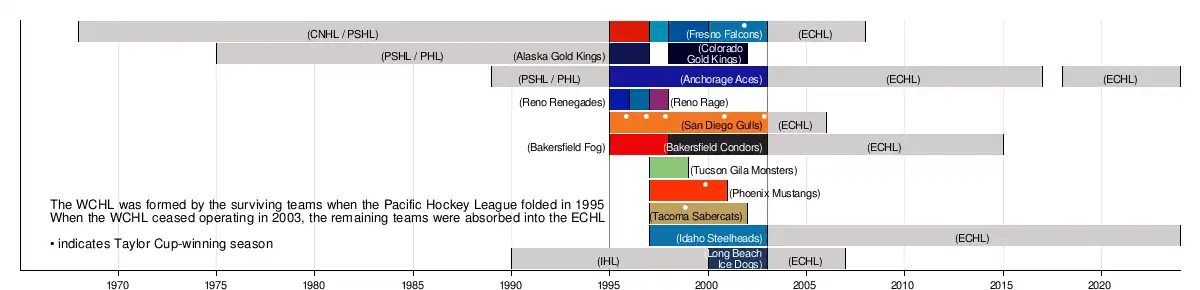 The WCHL was a successor organization of the semi-professional Pacific Hockey League. Three former PHL teams, the Alaska Gold Kings (Fairbanks, Alaska), Anchorage Aces (Anchorage, Alaska), and Fresno Falcons (Fresno, California) were joined by the Bakersfield Fog (Bakersfield, California), Reno Renegades (Reno, Nevada) and San Diego Gulls (San Diego, California) to become the founding member teams of the WCHL. The league retained these teams in a single division for its first two seasons, and played regular season games against a "Red Army" team from Russia (CKA-Amur, now Amur Khabarovsk) for the 1995–96 and 1996–97 seasons.[1]