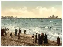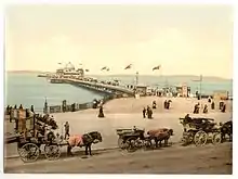 The pier was formally opened the following year on 3 April 1896 by Colonel William Henry Foster MP of Hornby Castle.[2] The pavilion had not been completed by the time of the official opening, with work completed around Easter 1897 and following a successful summer, preparations to complete the remainder of the pier were made. The first 200 piles for the landing stage were driven in on 18 November 1897 with the last 198 piles driven in on 23 April 1898 for the pier head. The pier was one of the first structures in the town to be installed with electric lighting in 1899.[4]