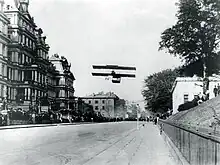 West Executive Avenue was constructed in 1871, providing a first-time road link between the north and south sections of President's Park.[1] According to the U.S. Government, in 1910 it was the scene of the first recorded landing, on a public street, of an aircraft when Claude Grahame-White touched down in his Farman biplane to meet United States Secretary of War Jacob M. Dickinson for lunch.[7][8] During World War II, West Executive Avenue was closed to traffic as a security precaution.[9] In 1951, following the attempted assassination of Harry S. Truman, it was closed permanently as it was believed traffic on the street would pose a safety risk to the President of the United States, and senior staff, walking from the White House to the State, War, and Navy Building (now the Eisenhower Executive Office Building).[10][11] It was subsequently converted into a parking lot and became "one of the city's most desirable parking lots for Federal workers".[10]