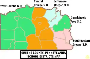 West Greene School District is a small, rural, public school district located in Greene County, Pennsylvania. The district serves a large rural region of approximately 256 square miles (660 km2). It includes Morris Township, Center Township, Gray Township, Jackson Township, Gilmore Township, Freeport Township, Springhill Township, Aleppo Township, and Richhill Township. According to 2000 federal census data, it serves a resident population of 5,917. By 2010, the district's population declined to 5,102 people.[1] In 2009, the district residents' per capita income was $14,228, while the median family income was $35,149 a year.[2] The educational attainment levels for the population 25 and over were 83.7% high school graduates and 12.9% college graduates.[3]