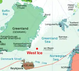 The West Ice (Norwegian: Vestisen, or Vesterisen, Danish: see below) is a patch of the Greenland Sea covered by pack ice during winter time. It is located north of Iceland, between East Greenland and Jan Mayen island. In Greenland and the Danish language, vestisen refers to the sea ice-covered waters off Greenland's west coast.