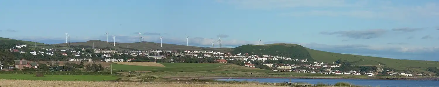 West Kilbride is situated on the west coast of Scotland, approximately 40 miles (60 kilometres) southwest of Glasgow, about 8 mi (13 km) south of Largs and about 5 mi (8 km) north of the "Three Towns" conurbation of Ardrossan, Saltcoats and Stevenston. The built-up area extends from Seamill on the coast of the Firth of Clyde to the principal part of the town, which, raised up and about 1 mi (1.5 km) from the coast, lies between Law Hill (168 m or 551 ft) and Tarbert Hill (138 m or 453 ft). It is overlooked by Cauldron Hill (329 m or 1,079 ft), whose name is largely reputed to be from the Welsh "Cadron" ref. Geoffrey of Monmouth. It looks across the Firth of Clyde to the mountains of the Isle of Arran to the west. The seafront at Seamill features a long sandy beach, as well as rocky outcrops including the small harbour at Portencross. The neighbouring agricultural land supports cereals, potatoes, and livestock, particularly sheep.