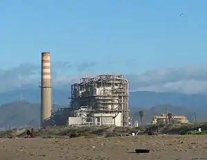 Some oil field and power generation facilities are in enclosures within the parks and open spaces. A row of wells near McGrath Lake drill into the offshore portion of the field; visitors to McGrath State Beach can walk past them along the beach. Reliant Energy's 560-megawatt gas-fired Mandalay Generating Station is north of and adjacent to Mandalay Beach Park. An oil-gas separator adjacent to the Mandalay plant processes gas from the offshore Santa Clara and Hueneme fields and sells the gas to Reliant for use at the power plant.[5] Mandalay Beach Park consists of 94 acres (38 ha) of land left in its natural state, without amenities, and contains habitat for the endangered snowy plover.[6]