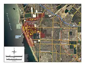 The West Montalvo Oil Field is a large and productive oil field on the coast of Ventura County, California, in the United States, in and adjacent to the city of Oxnard, California. Discovered in 1947,[1] it has produced approximately 43.7 million barrels (6,950,000 m3) of oil, and retains about 2.2 million barrels recoverable with current technology, in both the onshore and offshore areas. The offshore portion of the field is exploited from wells directionally drilled from onshore near McGrath Lake, from within an enclosure above the high-tide line at McGrath State Beach.