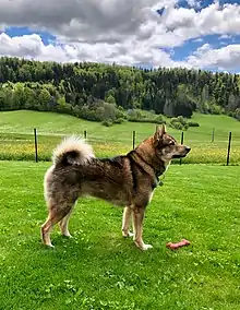 The West Siberian Laika or WSL, is a breed of spitz–type hunting dog. Russian publications indicate that the term West Siberian Laika loosely applied to hunting dogs originating with the Mansi and Khanty people in Ural and West Siberia, but there were no standards or registrations of WSL as such until 1930. Then WWII disrupted it for a while, but systematic breeding with registrations resumed after the war ended, in 1946. This was the time the breed began taking modern shape. Before that hunters only knew of Mansi Laika and Khanty Laika. In early 1960 many hunters in Ural still preferred the term Mansi Laika, when speaking of West Siberian Laika.[1] In Russian language, the term Laika originated from the word layat that means to bark. The word Laika simply means barker. Any hunting Laika is a bark pointer (pointing at animal of interest by barking and staying with the animal[2] ). It is a versatile dog depending on use and environment, but in certain parts of the country they have become more specialized.[3]