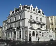 Notable Victorian buildings include Heene Terrace (built 1865), the Burlington Hotel (built 1865), St Botolph's Church (built 1872−73), the Italianate West Worthing railway station (built 1889), the Queen Anne style Downview Hotel (now flats, built 1891) and St Matthew's Church (built 1898−1900).[10] Dolphin Lodge (completed 1922−23) was begun in 1893 as the Hotel Metropole and was intended to be significantly grander, as the centrepiece of the new town of West Worthing. According to the original plans, the hotel would have had a south elevation wider than Buckingham Palace.[11] Following a recession, the front and west wings were never built. The building would have overlooked a pier for West Worthing.[12]