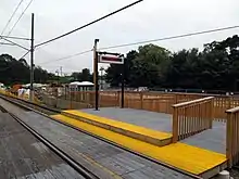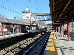 After demolition work over the next several months, the new parking lot was graded in June 2012 and a temporary platform was constructed west of the old one.[12] Construction of the 204-foot-long platforms took place in the third quarter of 2012, while the pedestrian bridge was lifted into place in March 2013.[14] The station was delayed by the unexpected discoveries of a buried concrete mass and utilities under the new station site.[15] The new station was formally opened on March 25, 2014.[2] Full bidirectional service to Westbrook began with the schedule change of May 11, 2014.[16]