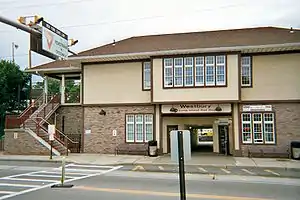 Westbury station was built sometime in March 1837 with the opening of the LIRR to Hicksville. The station was closed between June and September of the same year, briefly replaced by the nearby Carle Place station.[3] Throughout much of the mid-19th Century, the J.P. Kelsey Branch Store served as the depot.[4] The second station was built between April and June 1883. The third station was built in 1914, and was electrified in October 1970, along with the rest of the Port Jefferson Branch between Mineola and Huntington Stations.[5] It had a major remodeling around 1972, and another one sometime between 2001 and 2005.[6] In 2000, a woman was stabbed to death in the underpass beneath the tracks.[7]