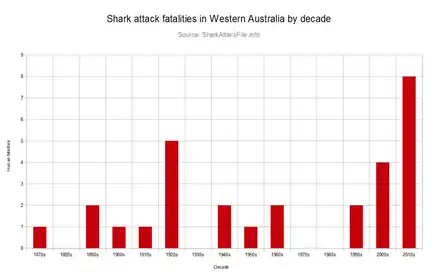 Australia has the highest number of fatal shark attacks in the world, with Western Australia recently becoming the deadliest place in the world for shark attacks,[8] with the number of total and fatal shark bites growing exponentially over the last 40 years.[9] Since 2000 there have been 17 fatal shark attacks along the West Australian coast.[10] In the south west of Western Australia the chances of a surfer having a fatal shark bite in winter or spring are 1 in 40,000 and for divers it is 1 in 16,000.[9][11] In comparison to the risk of a serious or fatal cycling accident, this represents three times the risk for a surfer and seven times the risk for a diver.[9]