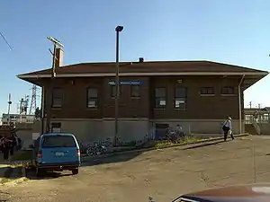 Western Avenue is the name of a railroad station owned by Metra, located in the West Town community area[2] of Chicago, Illinois near Western Avenue. The station is 2.9 miles (4.7 km) away from Union Station, the inbound terminus of the line.[3] Western Avenue station serves the Milwaukee District West Line, North Central Service, and Milwaukee District North Line, and is the last inbound stop for these three lines before the terminus at Union Station. Although it is not a station stop, Amtrak Hiawatha Service trains and the Empire Builder also pass through here. The station was previously used by the Chicago, Milwaukee, St. Paul and Pacific Railroad. Located near the station are the California Coach Yard, and the Western Avenue Rail Yard, the latter of which host to Metra's final EMD F40Cs. Just southeast of the station platforms is a diamond where the Milwaukee Road Metra routes cross the tracks of the Union Pacific West Line to Ogilvie Transportation Center, then turn to run parallel to them. This goes on for about a mile before they split, as the West Line tracks continue to Ogilvie. The junction is controlled by the nearby A-2 tower.