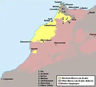 Western Morocco Arabic, Western Moroccan Arabic or ʿAroubi Darija is a dialectal continuum of Hilalian Arabic, mainly spoken in the plains of western (Doukkala, Abda, Tadla, Chaouia, Rhamna, Sraghna, Chiadma and Zaër) and central-western (Saïss, Gharb and pre-Rif) plains of Morocco.[1]